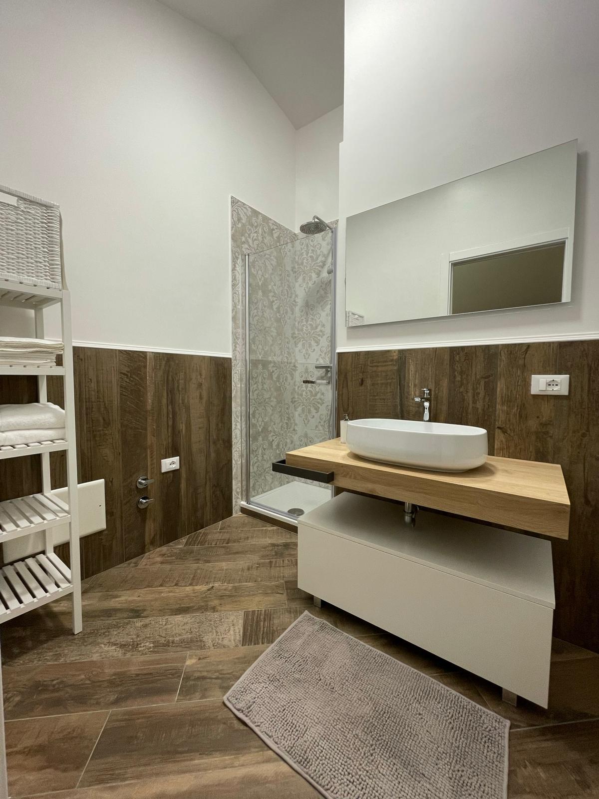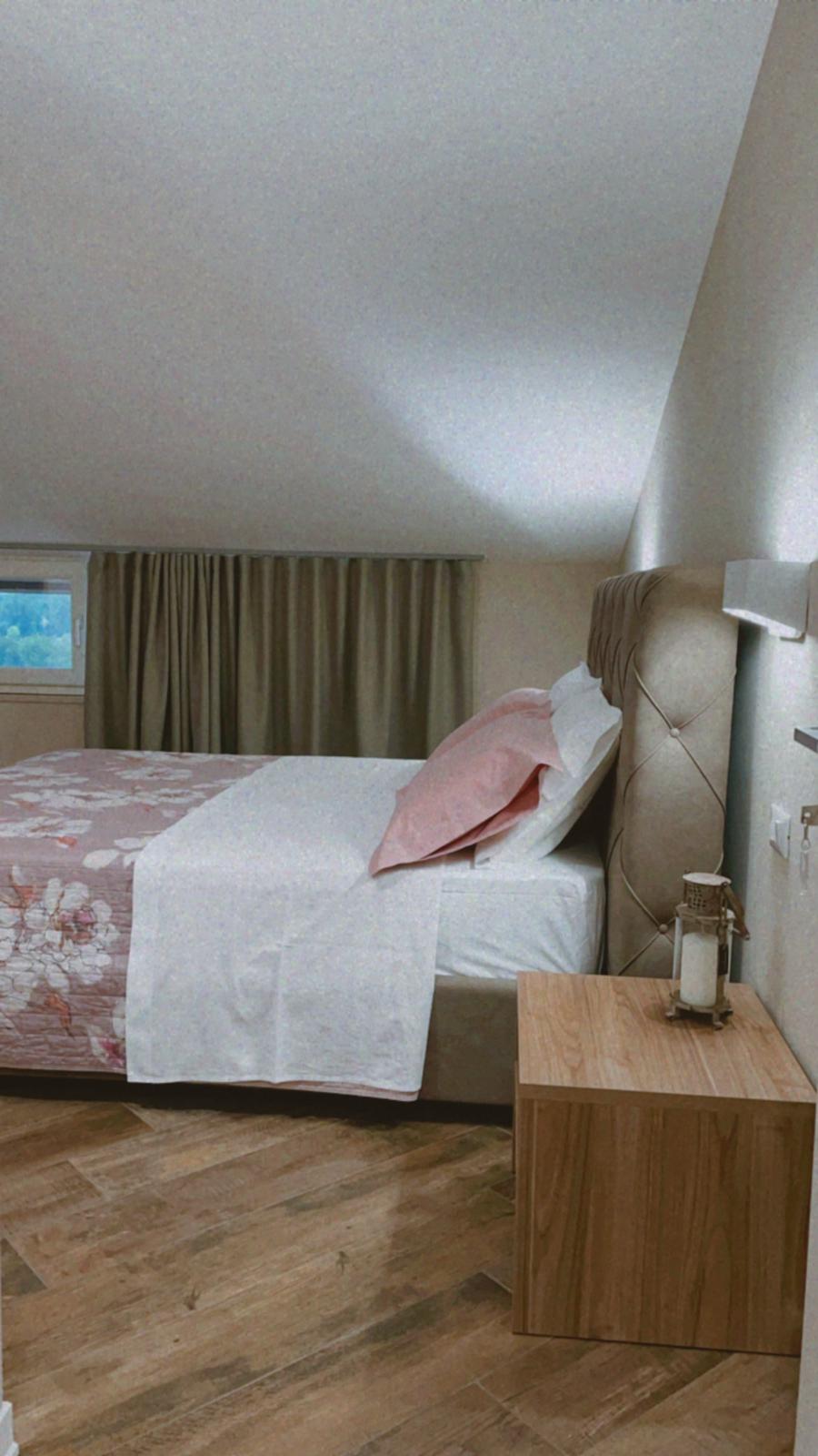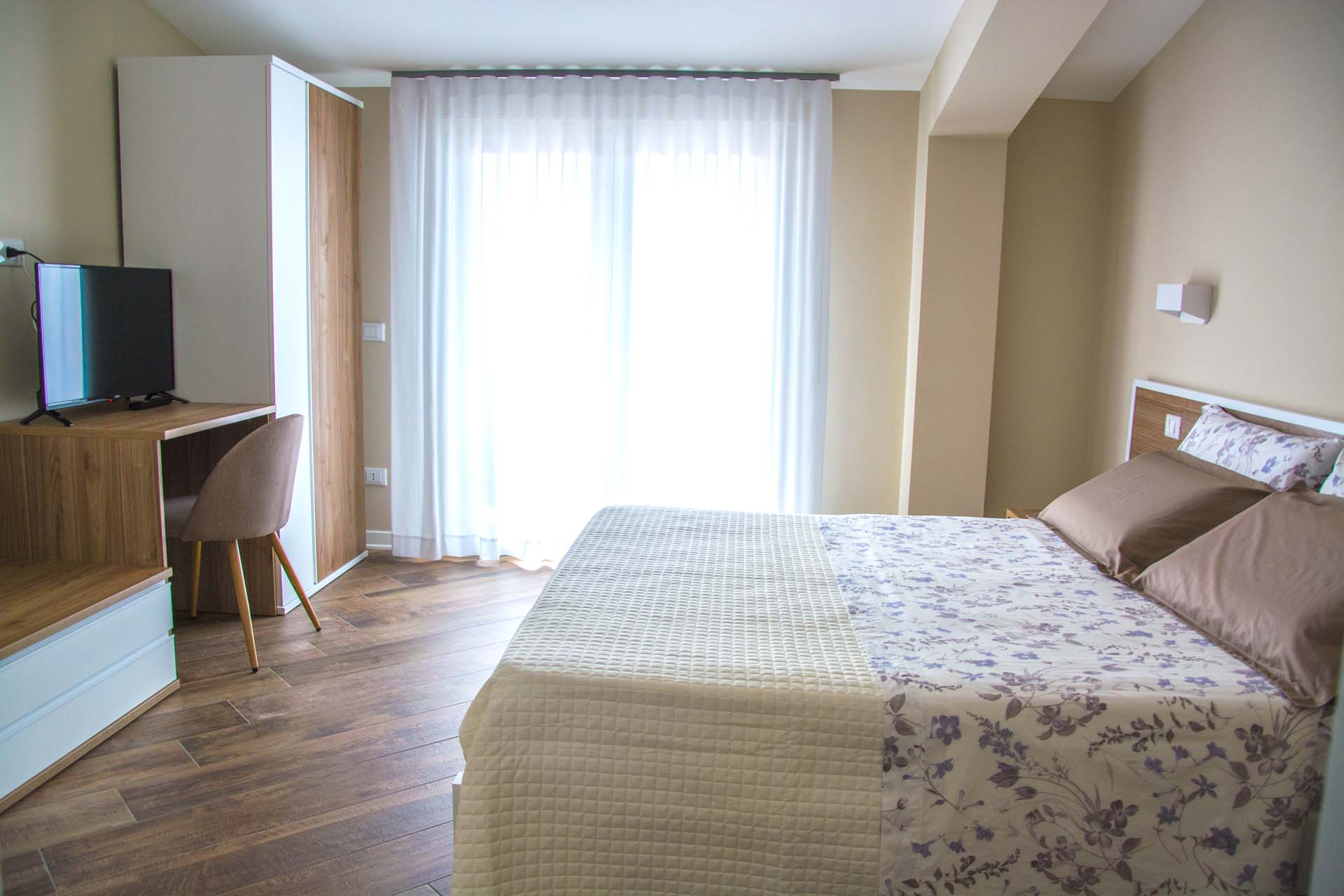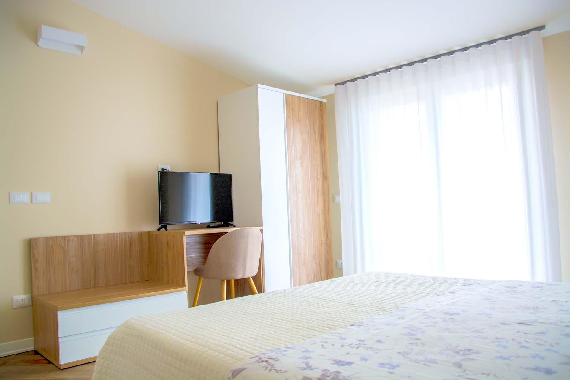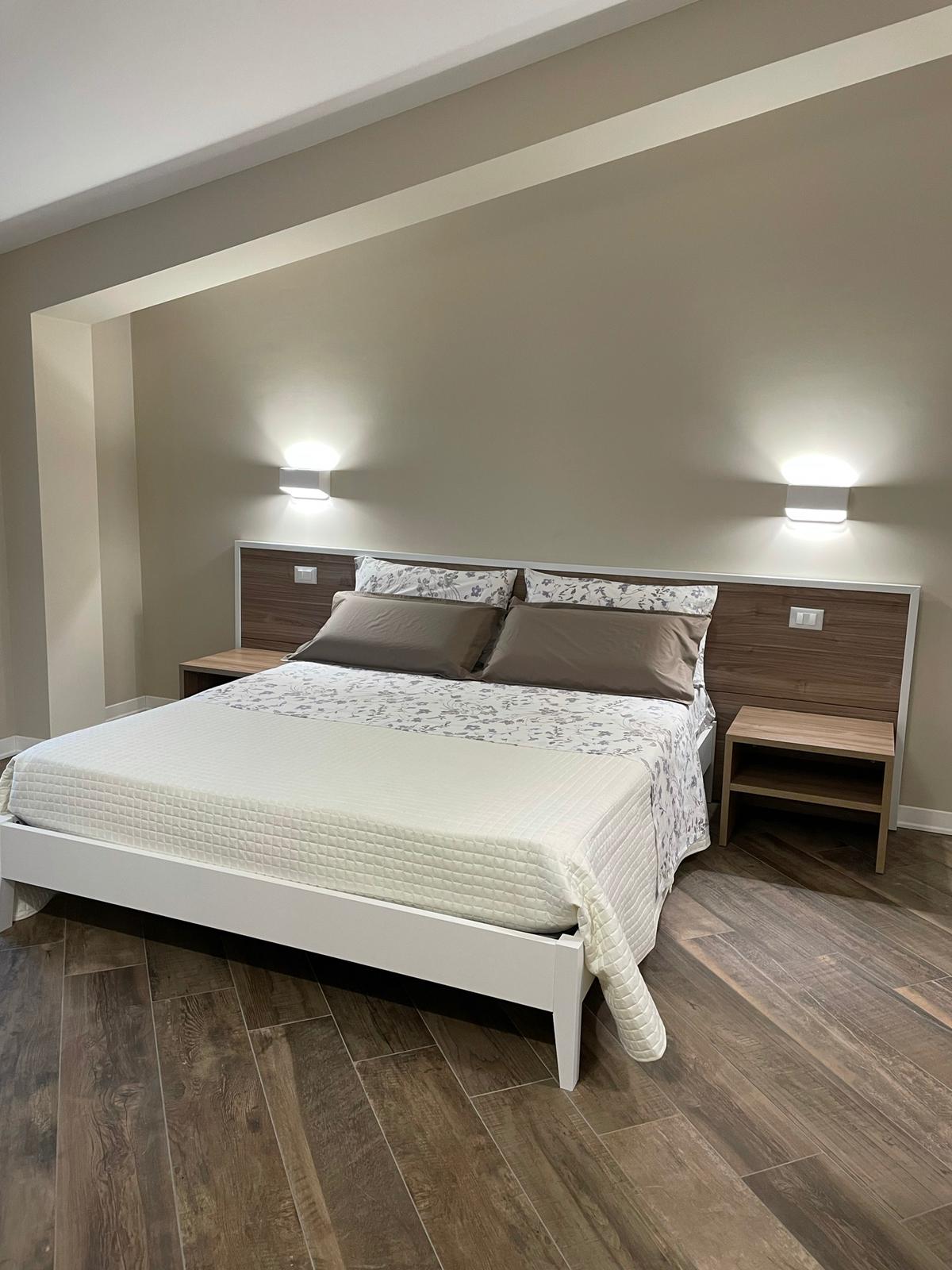 è una camera di circa 18 mq, provvista di ampia finestra, letto matrimoniale con testiera imbottita, armadio, scrivania con sedia, appoggia valigie, bagno in camera, finestrato,