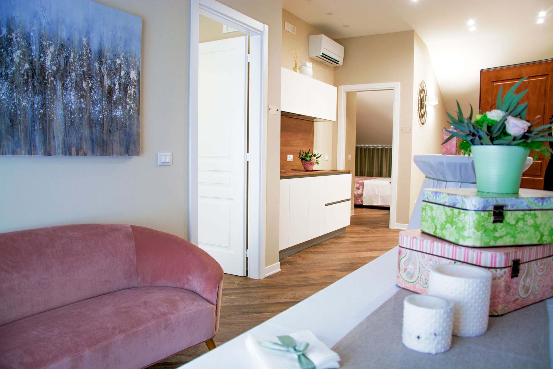 Ampio spazio colazione con cucina completa e salottino con tv e zona lettura.